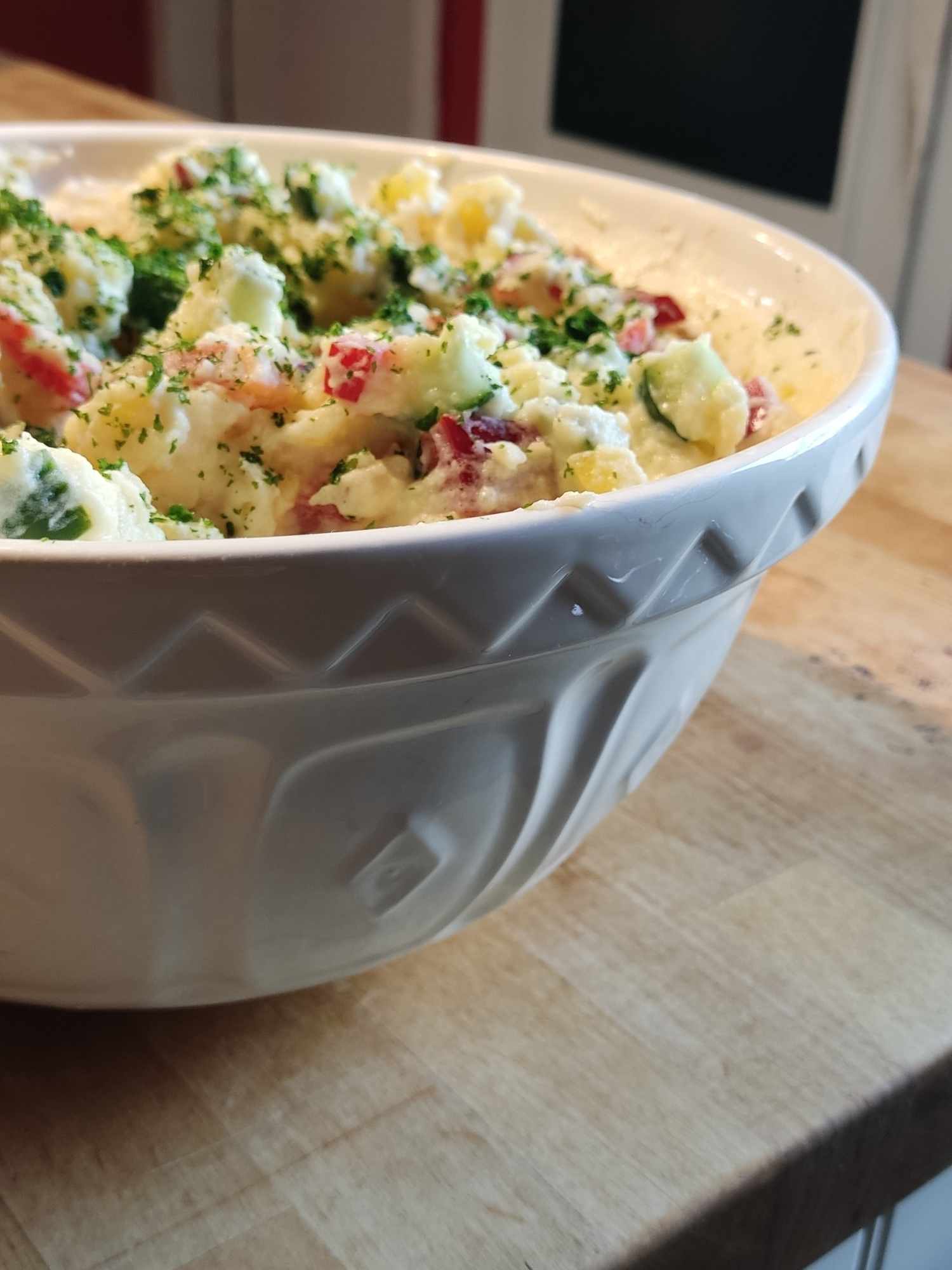 Leichter Kartoffelsalat mit Gurke, Paprika und Joghurt. Frisch und Lecker zum Grillen mit Familie und Freunden. Picnics oder Feste im …